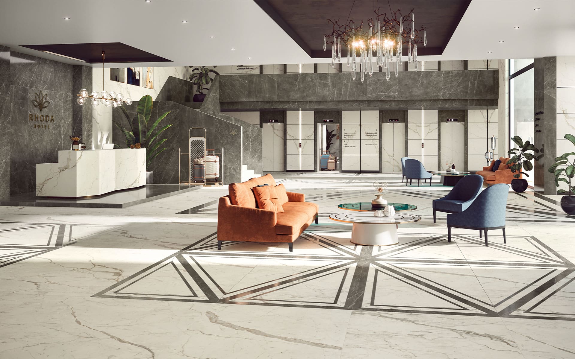 • Calacatta Prestigio On Lobby Front Desk, Floor, And Walls